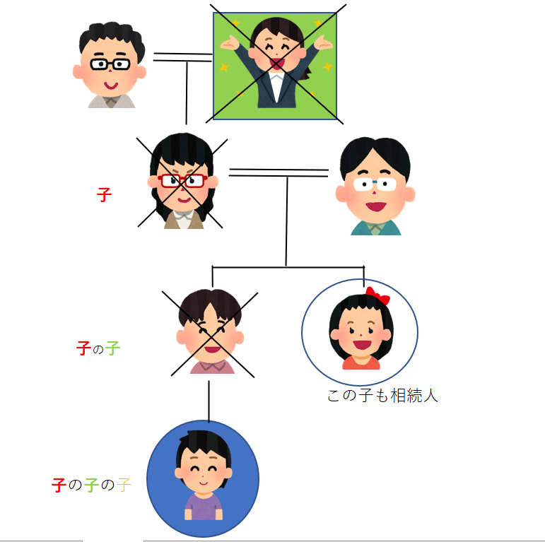 さらに、子の子も、被相続人より先に死亡や欠格事由、廃除されていた場合は、子の子の子が相続します。