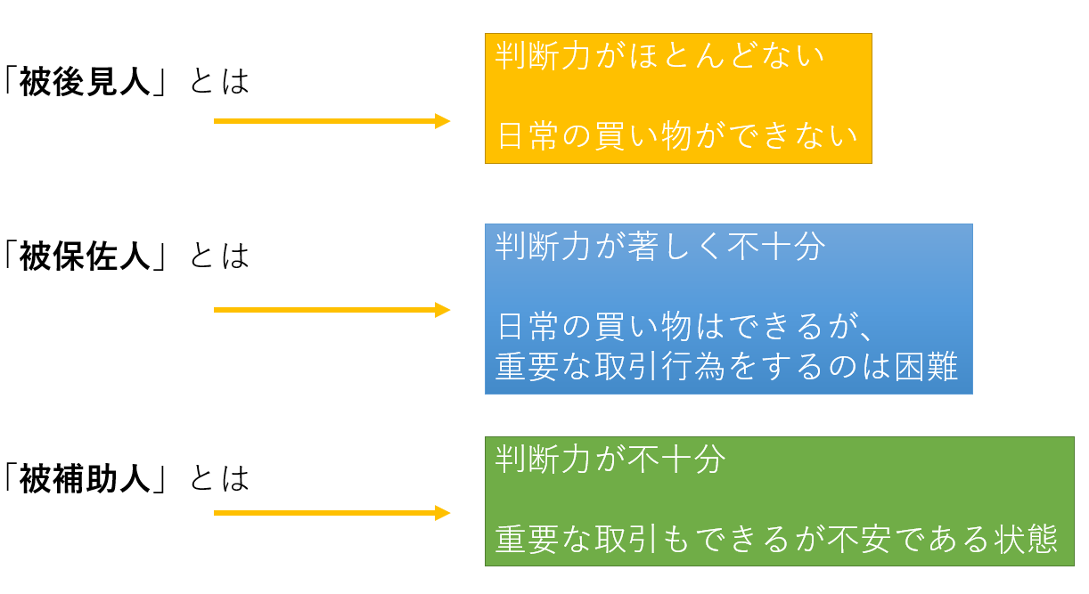 これは、本人の判断する能力の程度に応じて分けられているもので、本人を保護する人(後見人等)の代理などできる範囲が異なります。
